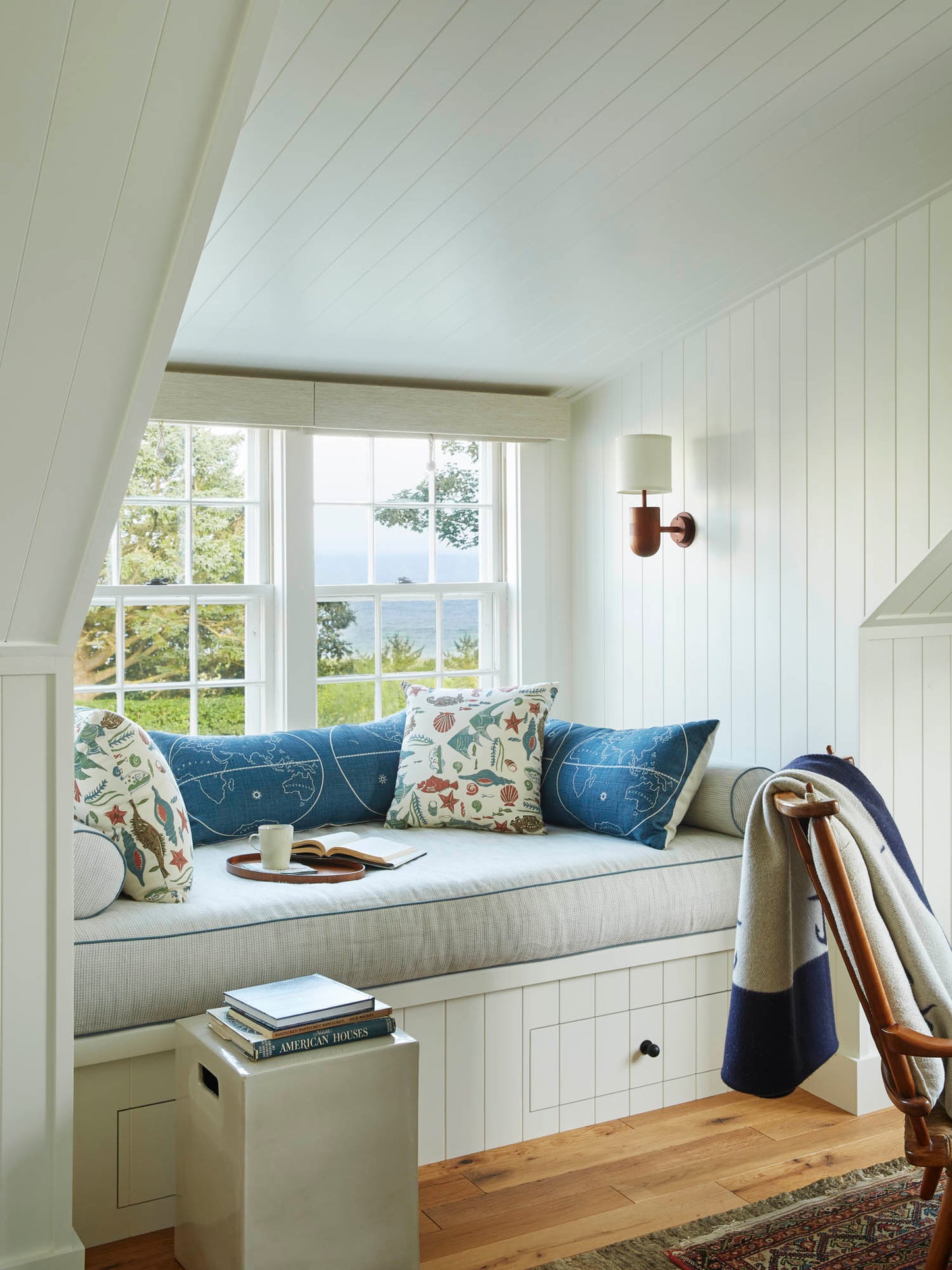 For most people, the more square footage, the better, but the couple was charmed by the postage-stamp size of Burgee Cottage (named after their goldendoodle). The house clocks in at 1,700 square feet, with “4 feet of outdoor space in every direction,” jokes Dunbar. Its location, steps away from the ocean in an area known to have been a hot spot for Broadway stars in the 1890s, trumped the size. Besides, months spent on a boat meant the couple were already masters at using up every nook and cranny and ducking around angled ceilings (for Hinderstein, who is 6 feet 1, it’s second nature no matter where he is).