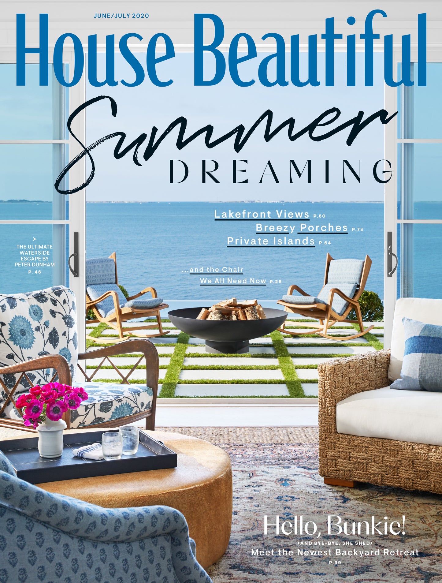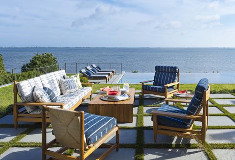 Throughout, abundant pattern cuts any sameness. But how do you mix prints without summoning a dizzy spell? “It’s a balance, almost like cooking, the way you have a rich sauce next to a plain piece of fish,” Dunham says. “I’ll add something like a paisley with stripes and then throw some solid in with the trim.” The final effect is as lively and deep as the bay beyond the windows. “To me, the atmosphere is way more important than the look,” Dunham says. “You don’t want guests to feel intimidated by your 10,000-square-foot house on the water. It should feel like they can kick off their shoes.”