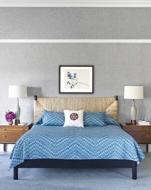 Dunham began by sheathing much of the interior in Benjamin Moore’s Simply White (“it’s clean, it’s airy, it’s bright”). Key rooms, on the other hand, received a colorful treatment: “You’re looking for ways to vary the notes so the whole house is not blue and white.” The designer installed a real wood wallcovering—de facto planking—in the den, and custom blue milk paint in the downstairs guest bedroom.