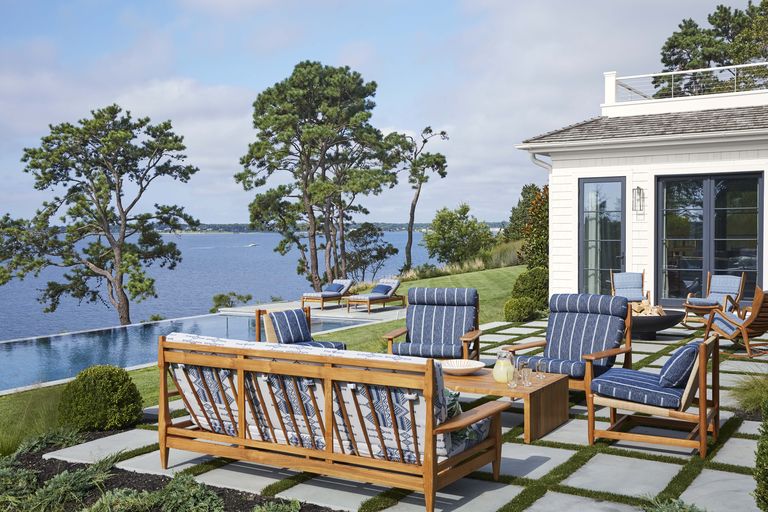 “It’s so rare to have trees between the house and the view; these big pines make it feel like the South of France to me,” says designer Peter Dunham of this Hamptons, New York, home. Furniture:Peter Dunham Home.