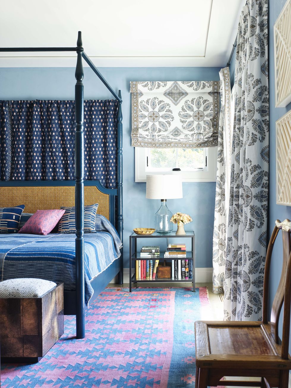 “This is the room everyone walks by when you’re coming into the house,” says Dunham, “so it’s got to be what the Duke of Devonshire would call ‘the state bedroom.’” Bed frame and bedding: Hollywood at Home. Bed-hanging: Peter Dunham Textiles. Wall paint: custom, Milk Company Paint. Stools: 1970s Paul Evans, LA Modern. Lamp: Pottery Barn. Rug: vintage Indian dhurrie.