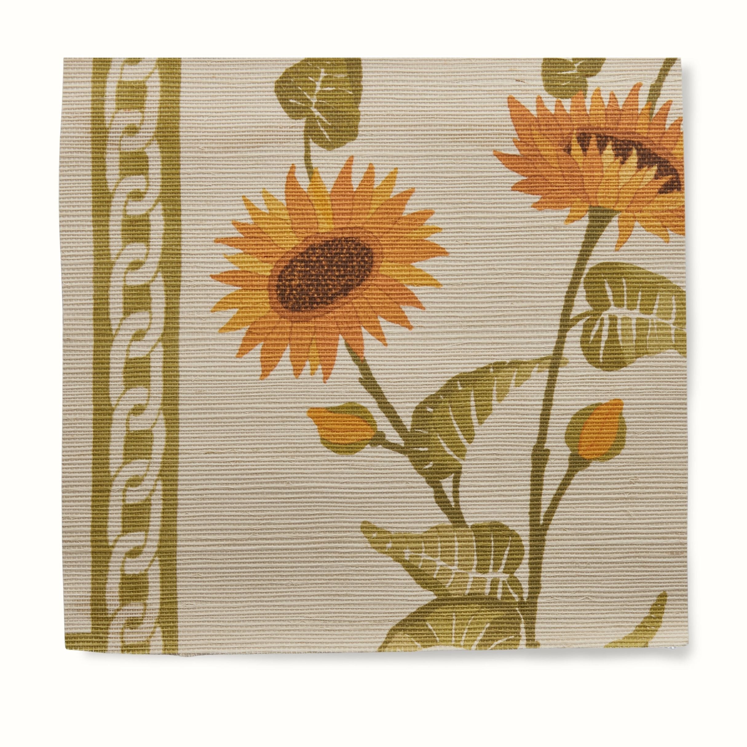 A stunning, large-scale floral with a chic chainlink detail recalls botanical papers. The Sunflower collection is based on a vintage embroidery Peter found years ago.