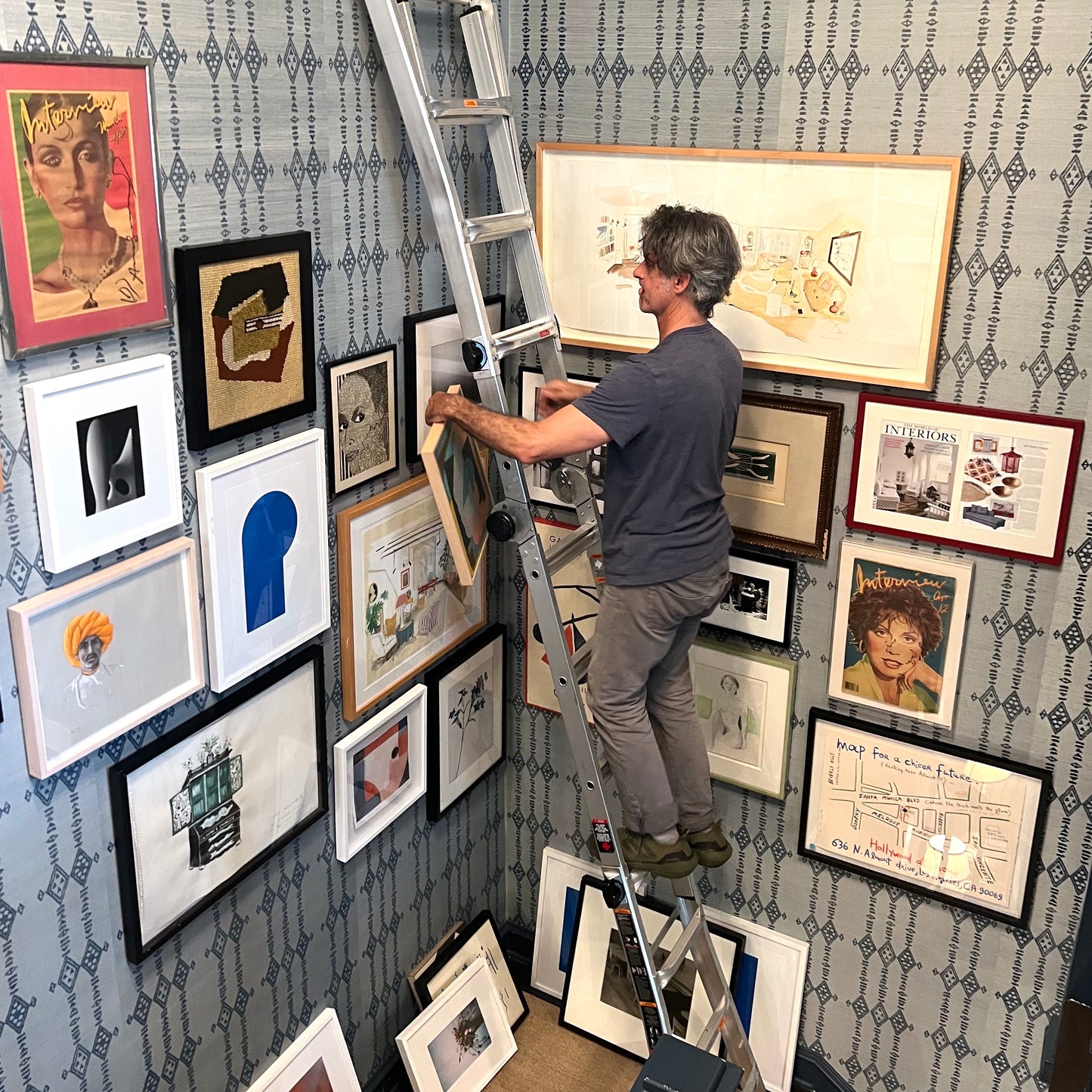 We love the look of layering art on wallpaper. In Peter's office entry hall, our Berber grasscloth is the backdrop for a dynamic gallery wall hanging.
